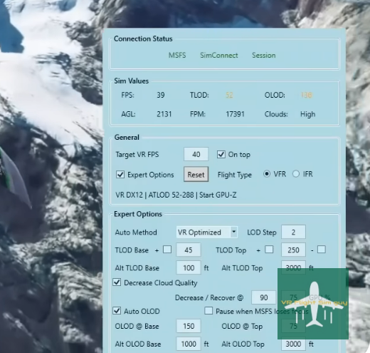 Why does it matter? VR can be very demanding on your system, especially when you’re running highly detailed simulations like MSFS 2024. With Auto FPS, your system dynamically adjusts graphical parameters (like terrain details, object quality, etc.) to maintain your target FPS, so you get smoother performance without compromising too much on quality.